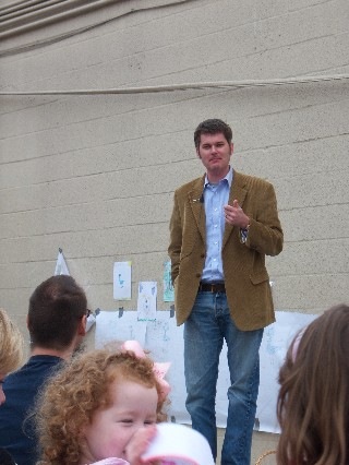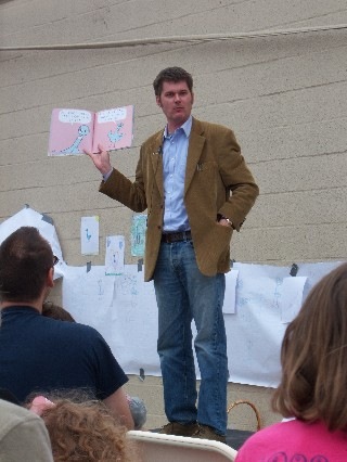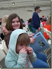 I know ... it looks like Sadie is going for the double finger nose pick but she is actually eating Cheerios. They set up the reading in the back alley/parking area with chairs and refreshments. It was kinda chilly but at least there was space!